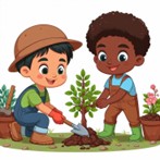 sekolah. Mereka bekerja sama dengan penuh semangat saat menggali tanah, menanam
